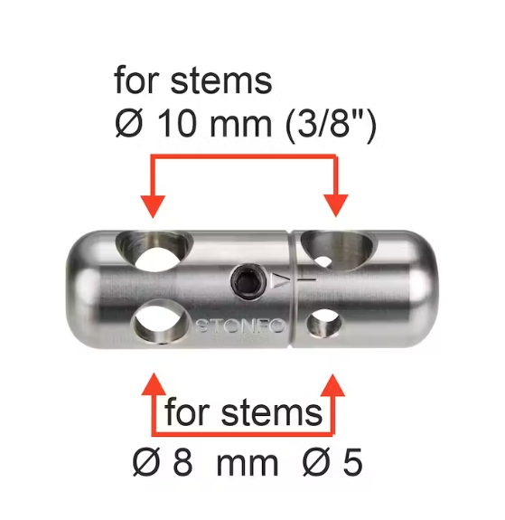 Stainless steel joint with angular adjustment. The packaging includes 1 joint, 1 extension stem 145 mm long and 1 allen key.